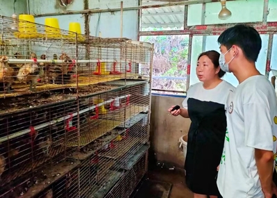 在对黑鸡养殖基地参观学习时,队员们依次走进了孵化车间、育雏车间、育成车间、包装快递车间以及销售直播间。从郭红金的口中,支教队员了解到,金山村从孵蛋到包装运输拥有一整套体系。对于乌骨鸡的养殖,则是“宽严并济”,一方面村民会为乌骨鸡提供严格的温度、天然的农家饲料与山泉水,并派专人打扫消毒,另一方面乌骨鸡又是散养的,可以自由在育成车间的吊脚楼下或者沃柑地里“散步”,如此造就了乌骨鸡的良好品质。