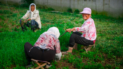 看到实践队员的到来,她们惊讶又欣喜地抬起了头。“你们好啊!”杨庙社区的大娘们热情地回应实践队员的问候。劳作的身影不只在田间,也在家门口。“之前的土地承包出去后,还剩下一部分,我们平时就自己种点粮食来吃。”说罢,正在家门口劳作的老人满脸幸福地向实践队员展示他们今年收获的玉米。老一辈人对土地总有着深厚的感情,那里浇灌过他们的汗水,流淌着他们的心血。杨庙社区内的老人一边和实践队员交流,一边拨动着手中的玉米。只是唠嗑的功夫,玉米粒便铺满了竹筐。