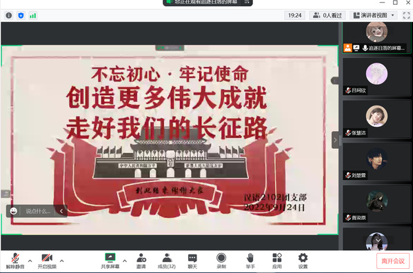 为了解党和国家在新时代取得的各方面事业的伟大成就与发展进程,鼓励广大团员不忘初心、砥砺前行,同时考虑到当下疫情防控工作需要,汉语2102团支部在9月24日晚上七点三十分使用腾讯会议平台召开了以“学习党史青年运动,砥砺奋进崭新时代”为主题的线上团日活动。该次团日活动由汉语2102团支部书记王淑娜主持,汉语2102团支部全体成员参加。