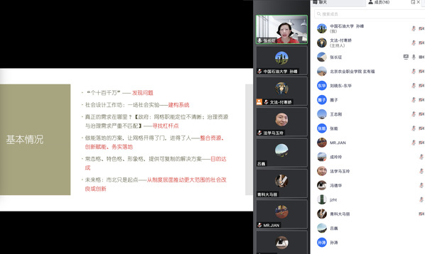 沙龙中,张长征教授分享了自己在2021年4月初所参与的社会设计工作坊项目。该项目由张长征女士协调来自各地的设计团队深入社区走访调研,并主持一轮又一轮的设计方案打磨、现场勘测、向周边居民做调查问卷。经过三个月的打造,已有12个网格方案完成,3处网格的空间改造工作完成并投入使用,并成为令网格所在地百姓惊喜的“民生打卡地”。孙峰副教授结合张教授项目对环境景观设计的相关研究提出:环境景观设计在为打造城市宜居、休闲、美观的公共环境的方面起着基础性作用,为了满足城市建设与人们对审美提升的要求,环境景观的设计与建造需要兼具环境与审美的双方面功能,对艺术性也存在一定的艺术要求。现代数字艺术在环境景观中的应用则能够在提升其设计效率的同时,使其更具有现代的艺术性美感,从而更加适应现在城市建设与人文环境塑造的需求。刘晓东教授提出:结合美丽乡村环境景观设计的相关研究,宜人性理念在新农村环境景观中的应用,提出新的设计应更加适应美丽新农村新环境设计的理念。系统讲述了上海郊区案例分析和实施情况,涵盖设计理念和国家乡村发展的关系与环境艺术设计协会的新的推广理念的阐述。工艺美术师孙涛提出:青岛城市数字灯光设计案例视频赏析和山东卫视城市战略定位与数字艺术设计案例分享。