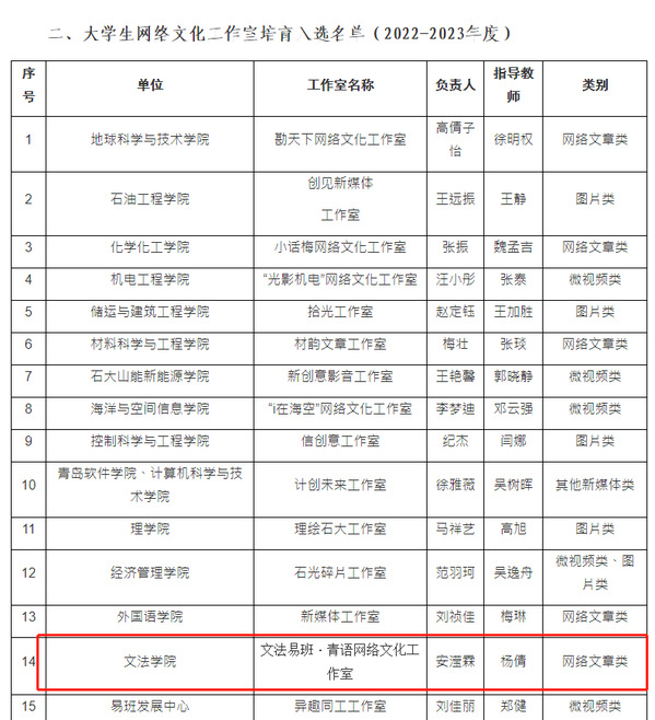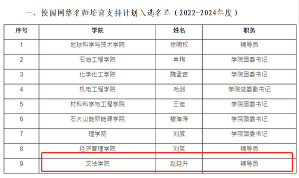 近日,党委学生工作部(武装部)公布立项培育校园网络名师及大学生网络文化工作室名单,我院辅导员赵延升入选“校园网络名师培育支持计划”,文法易班·青语网络文化工作室入选“大学生网络文化工作室培育”。