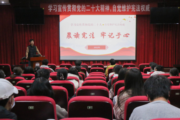 晨读过后,赵延升进行“踔厉奋发,勇毅前行,为法治中国贡献青春力量”的主题宣讲,主讲人赵延升以宪法为主题,以习近平法治思想为引领,从宪法最高效力、司法体制改革、经典宪法案例等多个方面向在场学生进行全面讲解。在此,赵延升指出,“当前党中央高度重视法治工作,作为法学生,自觉维护宪法权威是本责,更要学以致用,积极参加专业实习等社会实践项目,感悟不同法律职业的生活,明确自身发展定位,为法治中国自身贡献青春力量。”怀敬宪赤子心,逐法治家国梦。在宪法宣讲活动的最后,赵延升将“士不可以不弘毅,任重而道远”寄语在场学生,表达了对新一代青年法律人接续推进法治中国建设的殷切期望。