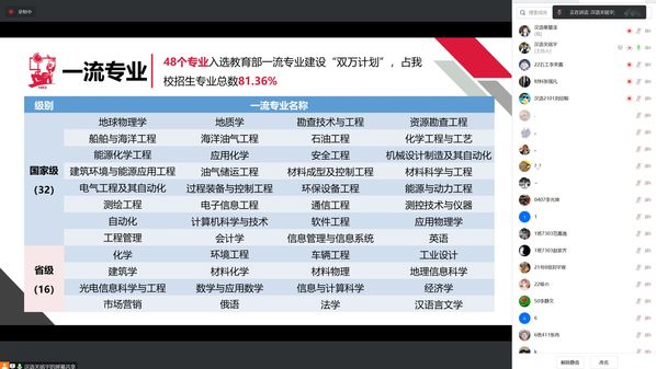 在最后的解疑问答环节中,实践队成员针对学生及家长提出的有关招生、专业学习、高中学习等问题做出了细致而全面的解答,分享了各自的学习经验与相关经历。互动现场气氛活跃,评论不断。在表达了对于大家参与本次宣讲的感激后,关铭宇表示,宣讲虽然结束,但用于联络的QQ群仍欢迎大家交流学习及答疑解惑,同时也提醒有意报考太阳成tyc122cc集团的学子与队员们保持常态性交流,队员们将提供一对一联系与指导。“感谢学长学姐们的分享,让我更深入地了解了美丽的石大,我会向着石大努力!”高二级部的刘湘泉备受鼓舞。