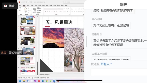 我校招生宣传片《少年·光》拉开了本次宣讲活动的序幕,充分调动了与会学子的兴趣与积极性,同时也使学子们建立起对我校的初步印象。宣讲伊始,关铭宇简要介绍了宣讲人员与宣讲流程,接着,队员栗慧泽简要介绍了我校的地理位置、学科实力、招生情况,让中学学子们充分了解到我校的雄厚实力与专业能力。其中,栗慧泽重点介绍了普通类招生、综合评价招生等招生类型,向学子们展示了多样的升学方式。接着,关铭宇向学子们详细讲解了我校的本研一体班等多种培养模式以及奖助学金政策,帮助学子们了解我校的优势与特色。之后,由张瑞凡向参会的高中学子们分享了我校的学习条件等高中生们极为关注的部分,“图书馆满满的都是学习氛围。”设施先进、氛围浓厚的图书馆引起了学子们的热烈讨论。PPT中美食美景、特色活动的照片及视频充分展现了我校的吸引力,激发了学子们了解我校、报考我校的积极性,纷纷表达了对学校多彩生活的羡慕与向往。