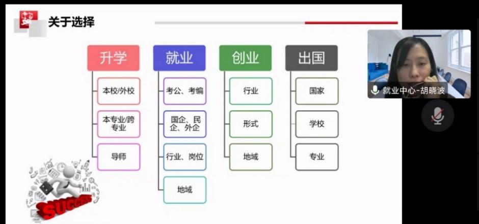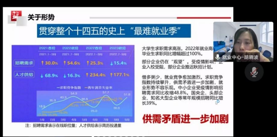 围绕着就业选择、就业形势、学校就业情况、就业准备四个方面,胡晓波结合当今毕业生面对的热点问题展开了详细的介绍。她分析了目前的就业形势,通过各种数据展示,指出当下就业形势十分严峻。