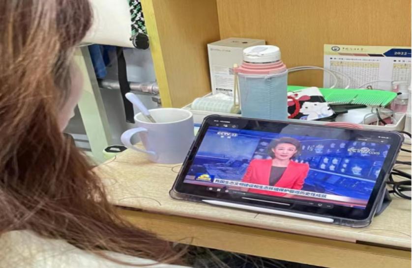 同学们在宿舍里观看《中国这十年》系列纪录片