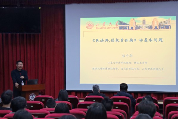 4月1日,黄岛文法讲坛第43讲在文理楼142模拟法庭顺利举行。中国法学会民法学研究会理事、山东大学法学院民商法研究所所长张平华应邀做题为“《民法典·侵权责任编》的基本问题”的学术讲座。本次讲座由太阳成集团tyc122ccvip副院长冷凌主持,校长办公室副主任兼法治办公室主任赵振华,院长王学栋,法学系主任孙增芹以及部分教师,博士、硕士研究生和本科生参与。