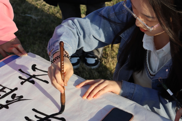青团制作结束后,汉语2201团支部成员进行了 “笔墨寄心”书法展示。几位成员挥毫题写缅怀先烈的诗句以寄哀思,一撇一捺中尽显青年风采,随后其他支部的成员们也踊跃参与,请教书法技术、体验书法魅力,用稚嫩的笔触表达了对先辈的怀念。