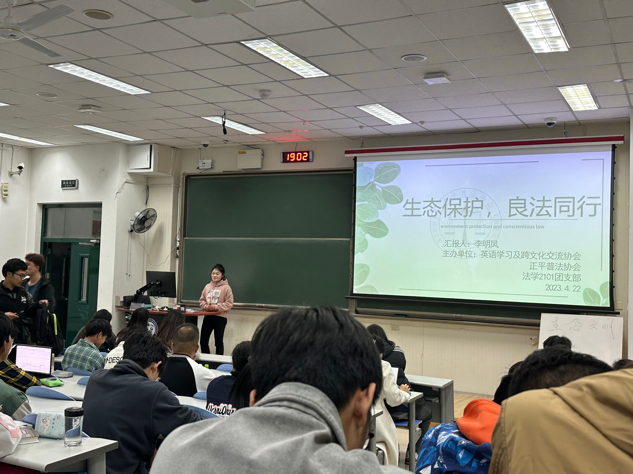 世界地球日之际,正平普法协会联合英语学习及跨文化交流协会、法学2101团支部于东环302开展以“生态文明”为主题的联合团日活动。