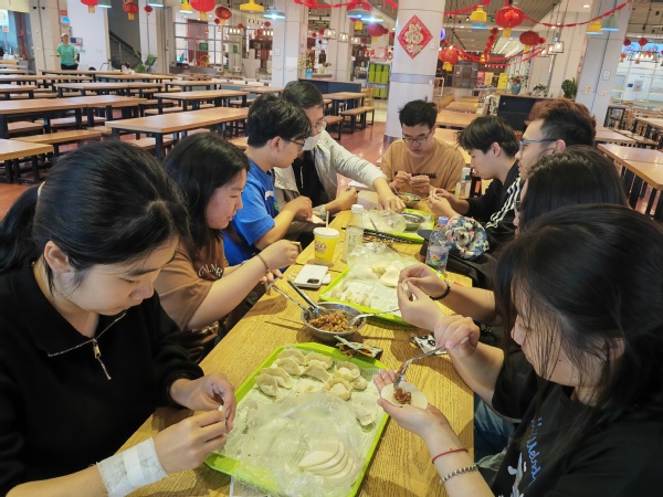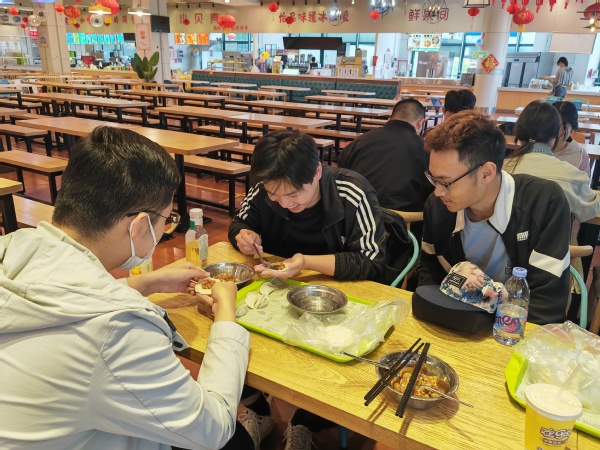 活动伊始,由本次活动负责人法学2202班心理委员沈舒讲述活动背景与目的,使班级成员更加认识到“爱自己”的重要性。紧接着,心理委员沈舒介绍活动内容。本次活动包括几个环节:花样大比拼(展示包饺子花样)、速度与激情(包饺子限时赛)、今日“饺”点(吃饺子)。活动相关规则介绍完毕后,环节依次开展。在“花样大比拼”中,班级成员纷纷大显身手:“太阳花”、“元宝”、“掐饺”、“月牙”、“珍珠”、“麦穗”等等花样饺子应有尽有;在“速度与激情”中,班级成员团结协作,手法熟练的成员一对一教学并帮助初学者完成包饺子活动,仅仅用时15分钟完成任务;在“今日‘饺’点”中,班级成员一同品尝花样饺子并发现秘密“惊喜”榨菜馅儿饺子,最是人间好景处。现场充满欢乐与温暖,定格那时的幸福。最后,法学2202班合影留念。
