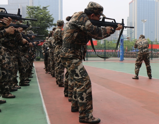 为进一步提升青年学子的国防意识,增强保家卫国的责任感和使命感,提高学生军事技能素养,下午,文法四营七连的学生继续学习轻武器射击据枪的相关知识并开展了相关实践。连长吴睿杰为学生们讲解了正确的持枪、瞄准姿势,扣动扳机的要领以及注意事项等,并以标准姿势作示范。接着,在场学生依次进行实践。随后,学生在两位教官的组织学习下进行齐步行进与立定、正步动作训练等内容。