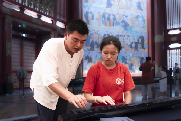 “我们在抚琴之前,第一个指法叫做临月观海式,就是双手抚于琴面,覆盖住所有的琴弦,十指合拢,好比于我们端坐在泰山之巅面临沧海,要开始抚琴了……”邱丽晔耐心地为实践队员讲解着古琴演奏的方式和技巧,并亲自下场“手把手”指导,让零基础的实践队员也有机会参与到古琴的弹奏之中。“听着老师弹琴、讲故事,跟着老师学琴,感觉自己的心也随之静了下来。突然想到了那句,‘音乐会唤醒人的灵魂’。”实践队员张雅晴表示自己非常享受这种雅致的氛围,并希望以后有机会接触学习一下古琴。