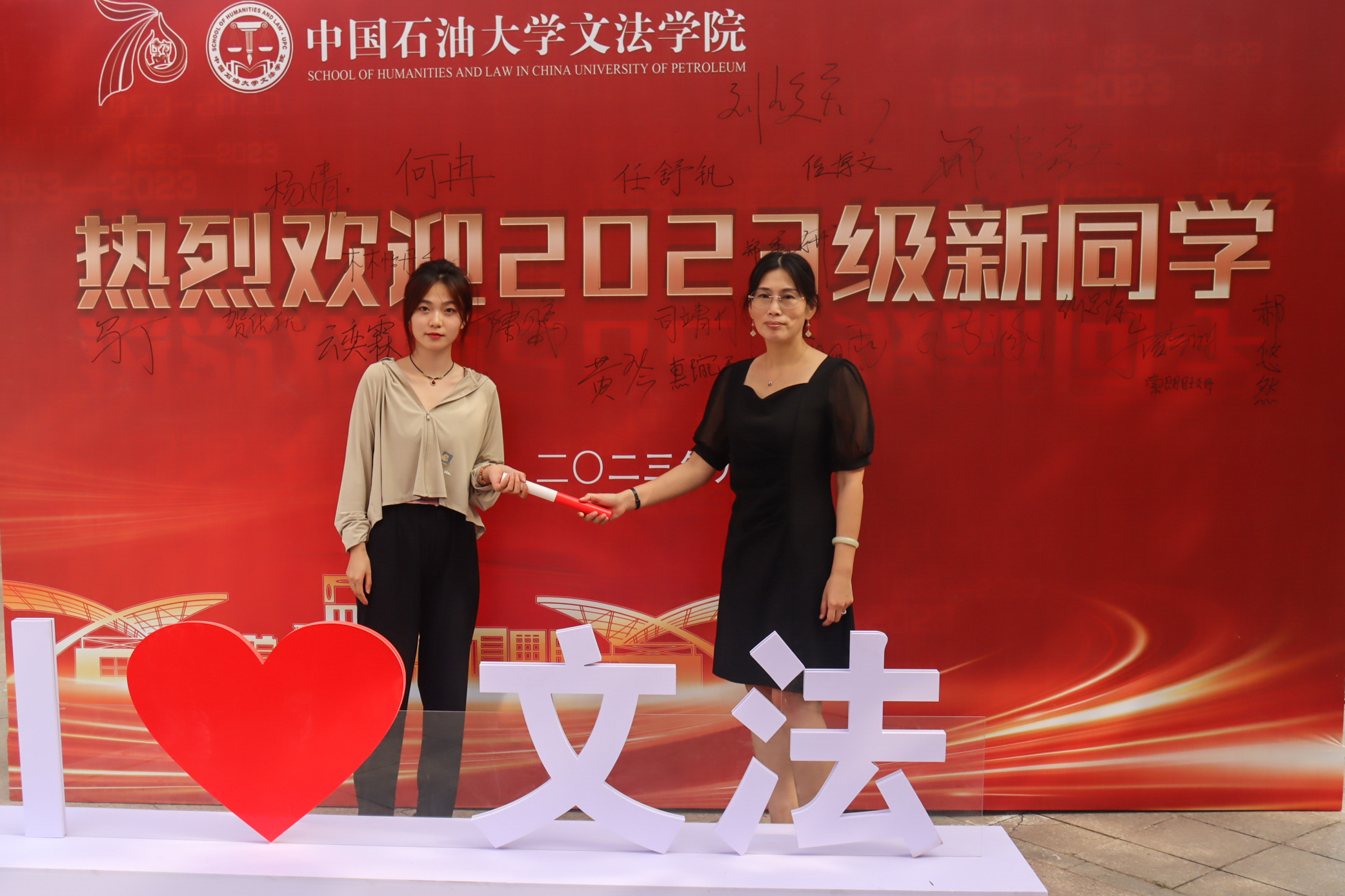 与往年不同的是,学院设计了别具特色的“传递接力棒”环节。王学栋院长,冷凌副院长,陈熙副书记等领导班子成员在合影区向2023级新生传递接力棒。一个小小的动作,传递的不仅仅是“家国同心、艰苦奋斗、惟真惟实、追求卓越”的石大精神,太阳成集团tyc122ccvip“博雅、求是、敬业、进取”的院风也会影响到新一代文法人,引导他们在今后的学习生活中见贤思齐,在四年的大学时光中成就更好的自己!