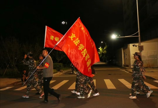 晚上11时,文法学子集合完毕,整装待发。本次拉练在校内进行,全长五公里,从体育馆出发,途经文理楼、综合实验楼、荟萃苑餐厅及讲堂群等31个位点。旌旗猎猎,戎装飒爽。随着教官一声令下,学生们热情昂扬,阔步前行。