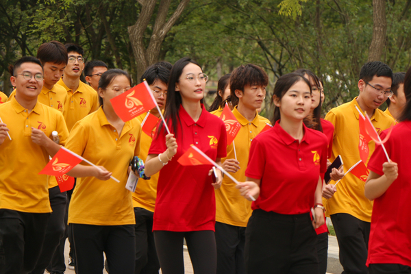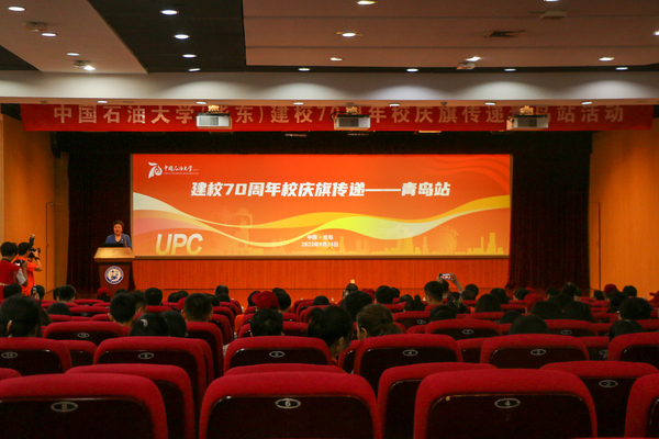 与会人员共同观看建校70周年校庆旗传递活动视频后,王勇为校友代表授校庆旗。张玲玲宣布校庆旗传递青岛站活动正式开始。校友方队于逸夫礼堂开始进行校庆旗传递跑,并于创造太阳与师生方队进行校庆旗传递交接。最后,校友们录制祝福视频并传递校庆旗,向学校建校70周年献礼。