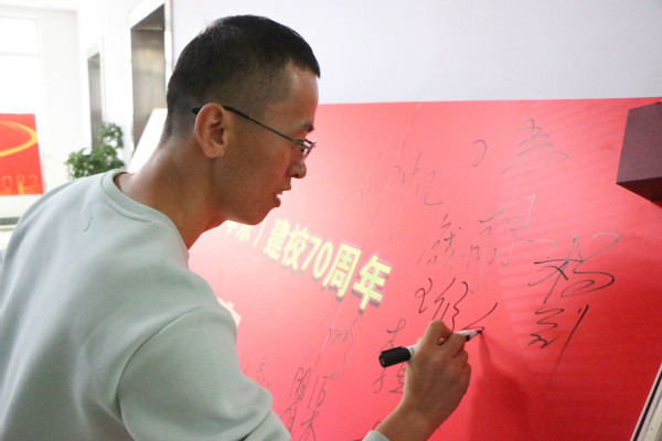 座谈会后,校友们在校庆签名墙签字,合影留念。随后共同参观学院文化墙,近距离感受学院发展脉络。