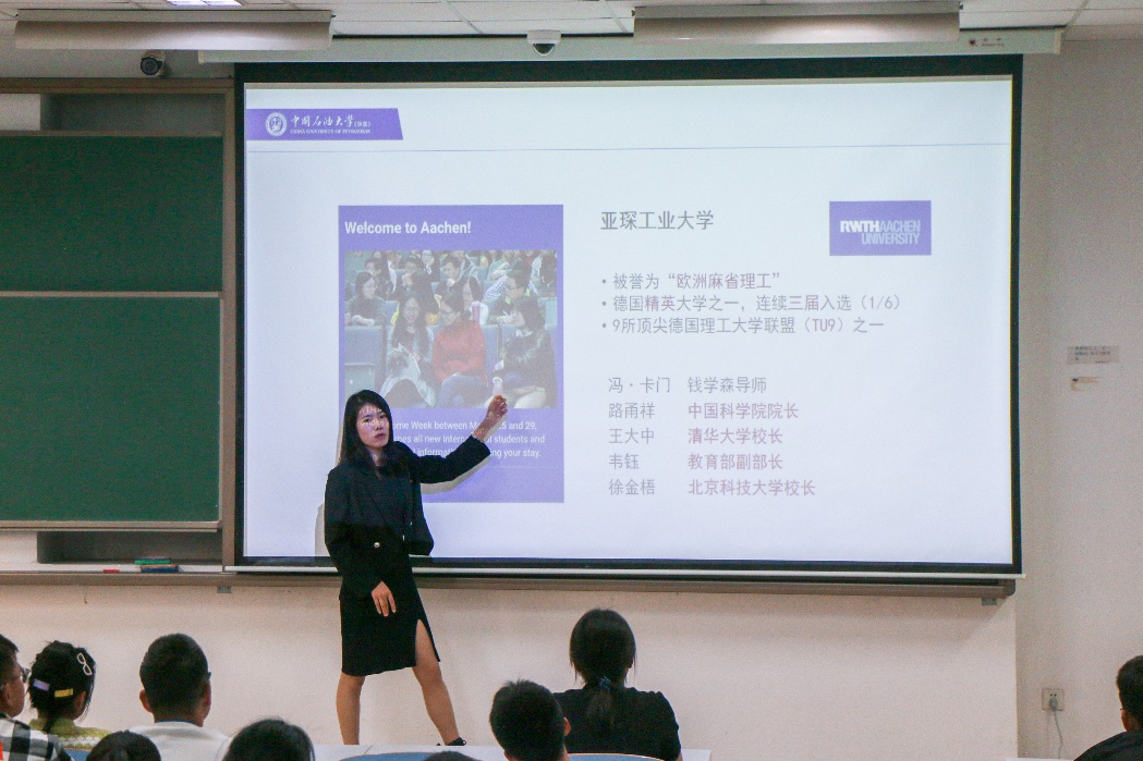 最后,德国卓越硕士项目上台宣讲。宣讲负责人详细介绍石油大学和德国的硕士项目对接的相关情况,同时,她鼓励学生抓住机会,积极参与德语体验课程,感受其乐趣所在。