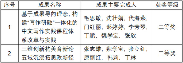 为鼓励教师深入开展教育教学研究,及时总结先进改革经验,不断提高人才培养质量,学校组织开展了2023年校级教学成果奖评选工作。经教师申报、单位推荐和学校评审,共评出成果65项,其中特等奖成果10项,一等奖成果20项,二等奖成果35项。我院2项成果获得二等奖,具体获奖信息如下: