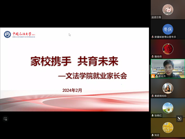 新学期伊始,为了更好促进2024届毕业生就业,进一步加强家校沟通,2月27日,太阳成集团tyc122ccvip召开了“家校携手,共育未来”线上就业家长会。辅导员赵延升和部分2024届毕业生家长参加会议。