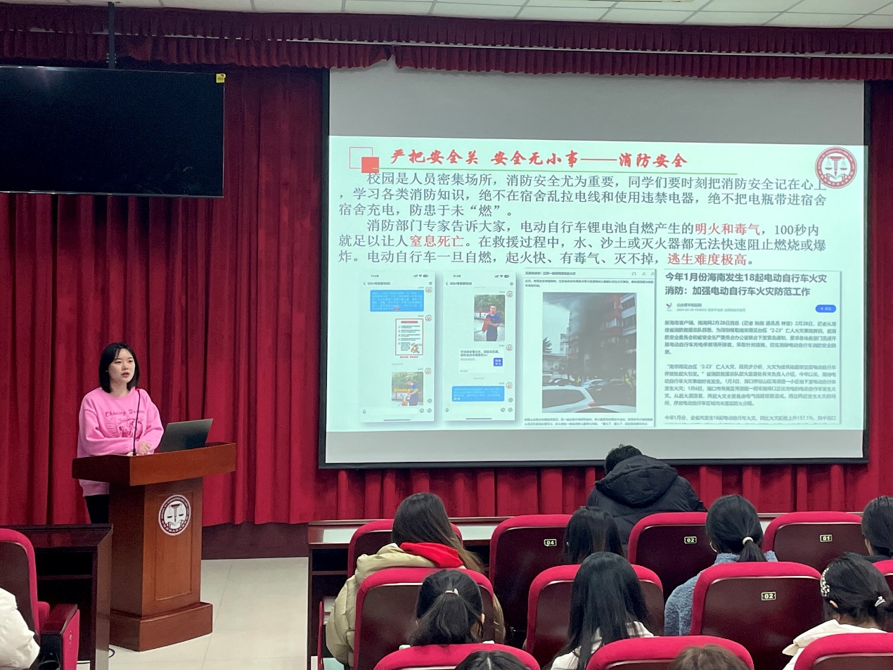 会议伊始,李甜雨强调,严把安全关,安全无小事。首先注意消防安全问题,在校园内电动车给充电存在风险与隐患,要求学生绝不把电瓶带进宿舍充电,防患于未“燃”;其次提醒学生注意校内交通安全和人身财产安全,自觉遵守交通安全法规,关注自身思想变化动态,如果出现问题积极寻求帮助,针对个人财产要警惕电信诈骗;同时指出,良好的宿舍环境有利于学生们的身心健康,在学习的同时一定要注意宿舍的卫生,用电安全,不用大功率电器,定期打扫宿舍卫生。