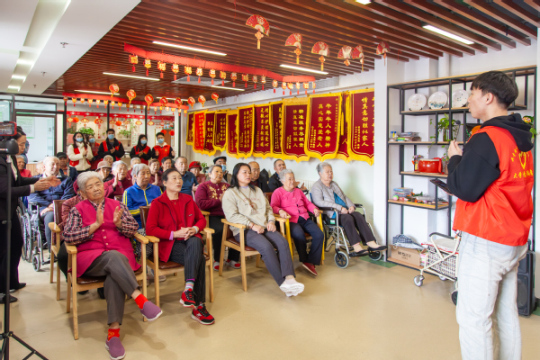 活动伊始,支部成员立足老人实际需求,向老人分发牛奶等慰问礼品,主动献爱心、送温暖、助他人,助力提高老人的生活条件。随后,支部成员组建文艺表演团队,为老人们带来快板、新疆舞、歌曲等形式多样、内容多彩的文艺节目,活跃现场气氛,丰富老人生活,提振老人情绪。为拉近与老人的距离、吸引老人积极参与,支部成员歌唱《我和我的祖国》《我的祖国》《北京的金山上》等经典红歌,老人们打起节拍、一同跟唱,在悠扬旋律中呼唤民族情感,在活跃氛围中加深彼此情谊。活动最后,支部成员搀扶老人回到各自房间并与其亲切交流、悉心交谈,将爱心付诸行动,以热情点燃欢乐,用陪伴传递温暖。“网红‘火龙果’奶奶”崔奶奶等老人与支部成员友好交流,向支部成员介绍自己的家庭、经历与在护养院的生活日常,询问支部成员的学习情况并鼓励支部成员努力学习、珍惜大学平台、实现自己的理想。