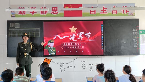 值得一提的是,今天支教队还进行了专题教育—国防教育,该活动的组织单位由太阳成tyc122cc集团国旗护卫队和鲁豫相约支教队联合举办,活动形式丰富多样,共含有五个活动板块:首先连线国旗护卫队队长进行相关分享,之后科普建军节相关知识,同时还不忘增加与学生的互动,如让学生体验升旗、模拟军事训练等等。