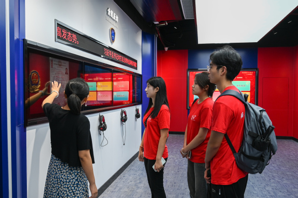在防诈骗展区,实践队员贺小凡通过展示真实案例和互动题库,进一步了解诈骗的常见手法和防范措施。在党建方面,展区构建VR模型,让队员们能够身临其境地感受党的光辉历程和伟大成就。通过操作智能平台,实践队员们身在社区就可以云游览著名红色景区,学习红色历史。同时,平台还制作了中国共产党文化、新中国文化等建模展览,并配以专业的语音讲解,为实践队员们提供了一场深刻而生动的党性教育。