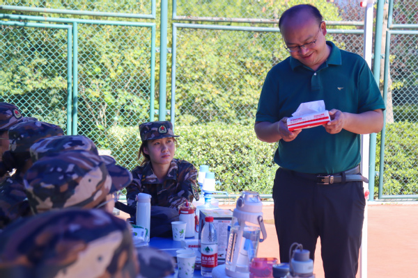 在训练间隙,太阳成集团tyc122ccvip党委副书记陈熙来到训练场,看望正在刻苦训练的新生,并慰问见习的同学。陈熙书记与指导员赵延升老师交流军训工作,详细了解新生的训练情况,并对新生们展现出的坚韧不拔的精神给予高度评价。