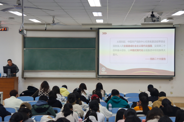 王庆忠带来主题为“中国共产党为现代化道路探索的百年奋斗历程——学习党的二十大报告精神”的课程。从建立现代民族国家意识入手,王庆忠带领学员们回溯历史,从晚清时期中国面临的民族危机讲起,深入分析了中国特色革命道路的形成过程。他详细阐述了党在百年历程中,从新民主主义革命时期为现代化创造根本社会条件,到社会主义革命和建设时期奠定基础,再到改革开放后推动快速发展,直至新时代为中国式现代化提供更为完善的制度保证、更为坚实的物质基础、更为主动的精神力量的不懈奋斗历程。他启示新时代青年,要坚定理想信念,传承红色基因;要练就过硬本领,努力学习专业知识;要勇于担当作为,积极投身中国式现代化建设的伟大实践。课程结束后,法学2403王艺诺深有感触地说:“这堂课程如同一场波澜壮阔的历史画卷,在王庆忠教授的讲解下徐徐展开。我深刻感受到中国共产党在现代化道路探索上的艰辛与不易。我们作为新时代的青年,应当继承和发扬先辈们的革命精神,以党的二十大精神为指引,在实现中国式现代化的征程中奋勇向前。”