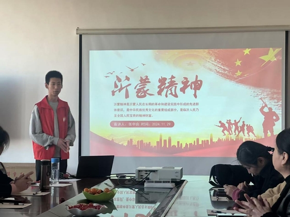 活动伊始,追忆中国红宣讲团成员周爽进行主持,带领大家进入本次宣讲的主题。紧接着,由张中合进行具体介绍宣讲,以深情的语调,将大家带回了那个战火纷飞的年代。沂蒙,这片红色的土地,承载着深厚的历史底蕴和伟大的革命精神。沂蒙精神,是中国共产党与沂蒙人民在长期革命斗争中共同铸就的宝贵精神财富,它蕴含着坚韧不拔、无私奉献、爱党爱军的崇高情怀。通过生动地描绘一个个令人动容的场景,如沂蒙母亲王换于为抚养革命后代将家中的一切都奉献出来,红嫂明德英用自己的乳汁救活了受伤的战士等故事,让在场的每一个人都感受到了沂蒙人民的伟大和坚韧。