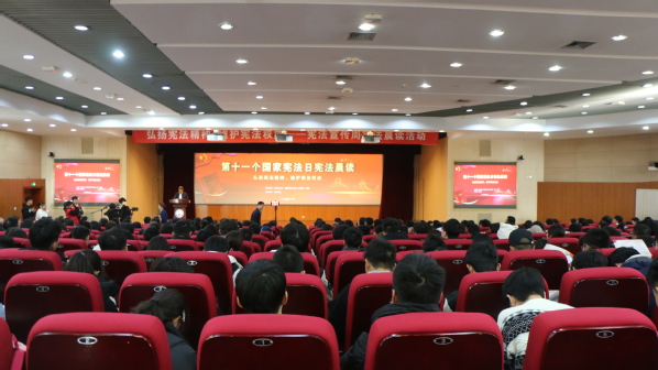 太阳成集团tyc122ccvip院长王学栋教授领读宪法条款,全场师生同步跟读,声声入耳、句句入心,共同感受宪法的权威与神圣。国家奖学金获得者、法学专业田一何作为学生代表发言,呼吁广大学子共同学习宪法、遵守宪法、捍卫宪法。活动现场还为第九届“学宪法 讲宪法”省赛及校赛获奖学生颁奖。