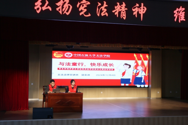 与此同时,文法法律宣讲团深入中小学,在青少年心中播撒法治的种子。在青岛西海岸新区星海湾路小学、团结路实验学校以及西海岸新区实验中学的教室里,宣讲人通过互动问答等方式寓教于乐,使抽象的法律条文变得鲜活起来,极大地提升了学生们的参与度和学习兴趣。12月2日至3日,宣讲团联合第26届研究生支教团贵州关岭分队、甘肃静宁分队,分别在顶云街道中心小学和平凉机电工程学校顺利开展线上宪法宣传活动,将精心打磨的宪法知识体系输送到支教地区学生身边。宣讲人从宪法的基本概述出发,详细阐述了公民的基本权利和义务,并紧密结合日常生活中的实际案例,生动展示了宪法在现实生活中的应用与体现,点燃了青少年学习宪法的热情。