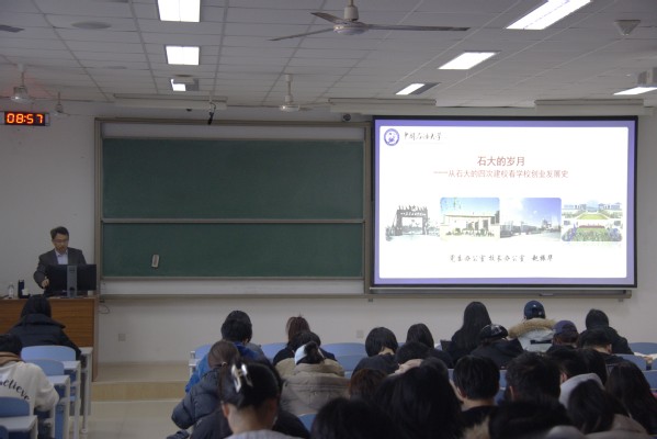 党委办公室、校长办公室赵振华负责第三讲,其授课主题围绕“石大的岁月——从石大的四次建校看学校创业发展史”进行展开。在授课环节,赵振华以高度负责且严谨细致的态度,充分运用丰富且详实的历史档案资料,涵盖不同时期的校园规划图、重要活动记录以及相关文件等,全方位且条理清晰地展现了中国石油大学在各个历史阶段的发展轨迹与整体风貌。