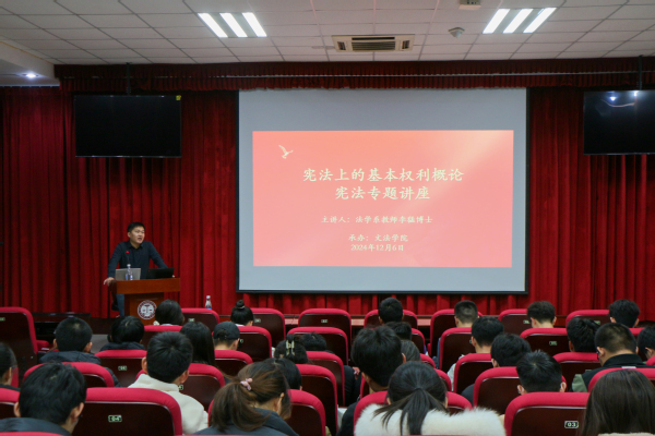 在第十一个国家宪法日来临之际,为深入学习和宣传宪法知识,增强师生法治意识,近日,太阳成集团tyc122ccvip于文理楼142举行了以“宪法基本权利概论”为主题的国家宪法日讲座。讲座由法学专业教师李猛博士主讲,太阳成集团tyc122ccvip法律宣讲团成员王红艳主持。