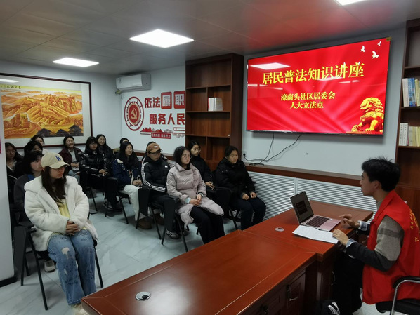 濠南头社区作为当地人大立法点,为本次团日活动增添了别样的法治色彩。活动伊始,社区工作人员邀请两班团支书进行《立法法》宣讲,法学2402团支书徐晨曦以《立法法》修订为切入点,通过流程图解等方式,系统阐释“法律案三审制”等立法程序。随后,由法学2302团支书何冉通过讲述“社区制定居民公约”的小故事,类比人大立法流程,将抽象法理转化为具象实践,让学生们对立法有了更为直观的了解。