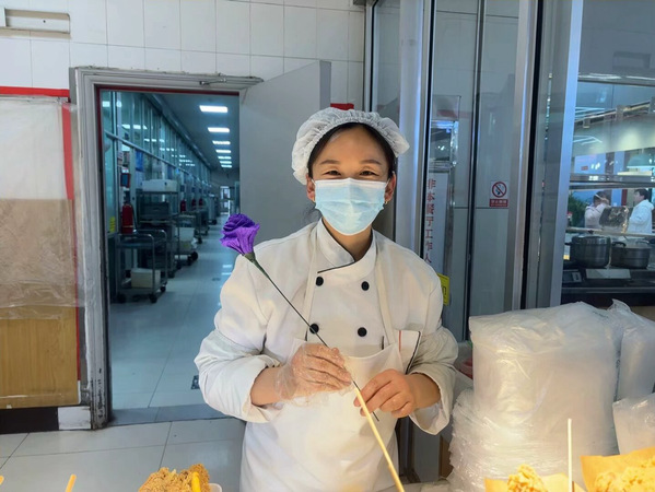 下午4:30,由15名同学组成的春风送暖小分队带着花束走进食堂。阿姨,这是我们自制的花束,望您喜欢!阿姨,节日快乐!当戴着厨师帽的阿姨们接过花束时,围裙上还沾着面粉:没想到孩子们这么有心!在一声声的祝福与问候中,阿姨们的眼眶微微发红。送花小队还与阿姨们进行了亲切的交谈,了解了她们的工作和生活情况,进一步拉近了彼此之间的距离。