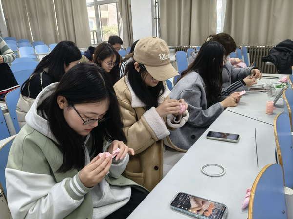 下午2:00,活动在《学习雷锋好榜样》的旋律中拉开序幕。团支部书记吴明涵通过展示新时代楷模事迹、雷锋事迹等资料,引导支部成员思考当代青年如何传承雷锋精神。在手工制作环节,支部成员分成不同小组,用皱纹纸、铁丝等材料精心制作玫瑰花束。花瓣要一层层包裹才有层次感,团支部成员张文雨边示范边讲解,她将折纸经验与对劳动者的敬意融入每片花瓣的褶皱中。经过两小时的学习与协作,30多支形态各异的褶皱手工玫瑰在课桌上绽放出春日的绚烂。