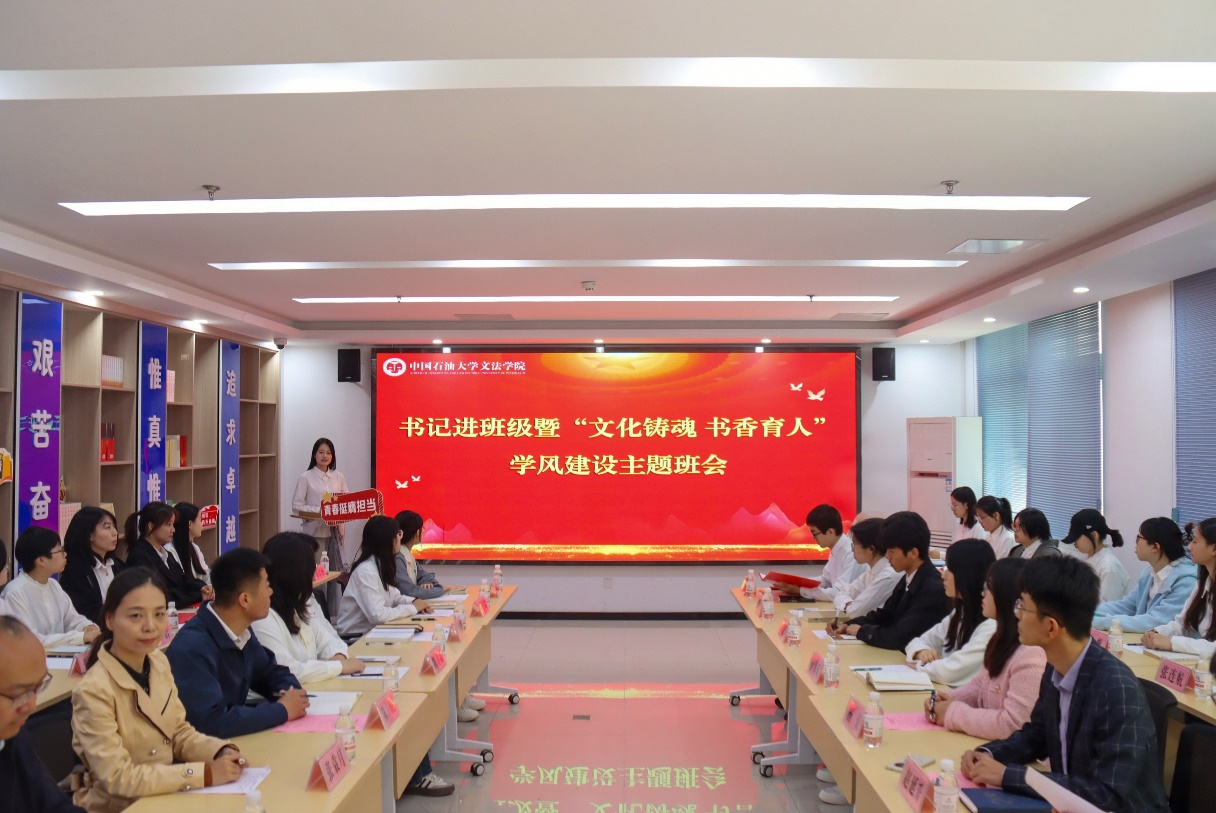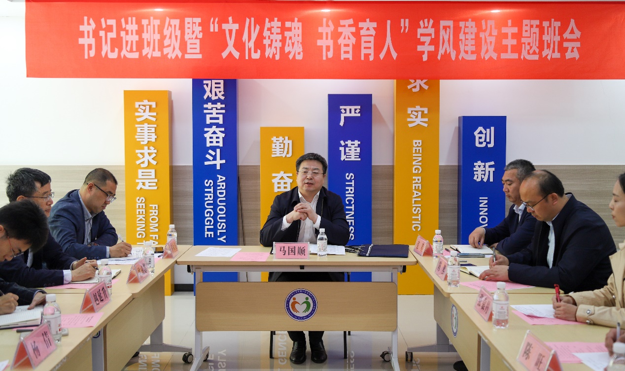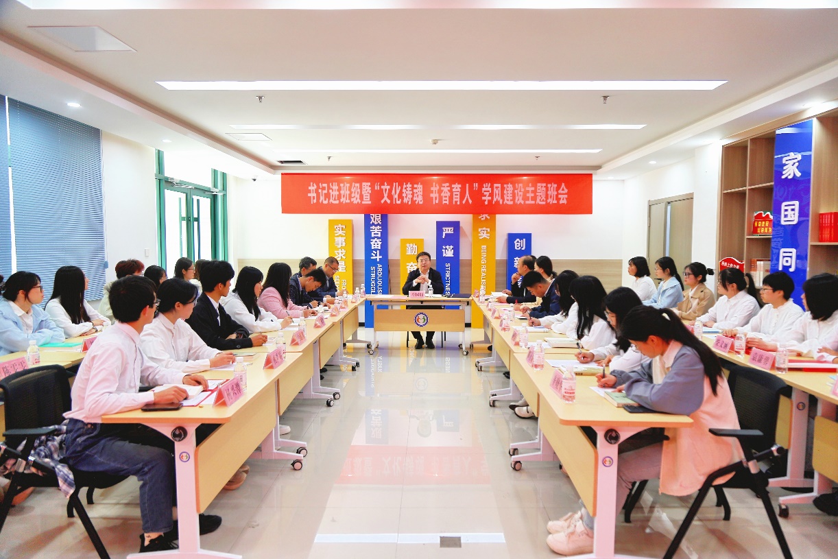 为深入学习贯彻全国两会精神,担当新时代文化使命,促进优良学风建设,4月24日,校党委副书记马国顺走进太阳成集团tyc122ccvip汉语2201班,指导班级开展“文化铸魂·书香育人”学风建设示范性主题班会。活动在“一站式”学生社区报告厅举行,由汉语2201班团支部书记刘佳怡主持,党委学生工作部(武装部)部长张程,校团委书记季林海,太阳成集团tyc122ccvip党委书记姚成郡、学工队伍及汉语2201班班主任张袁月一同参加活动。
