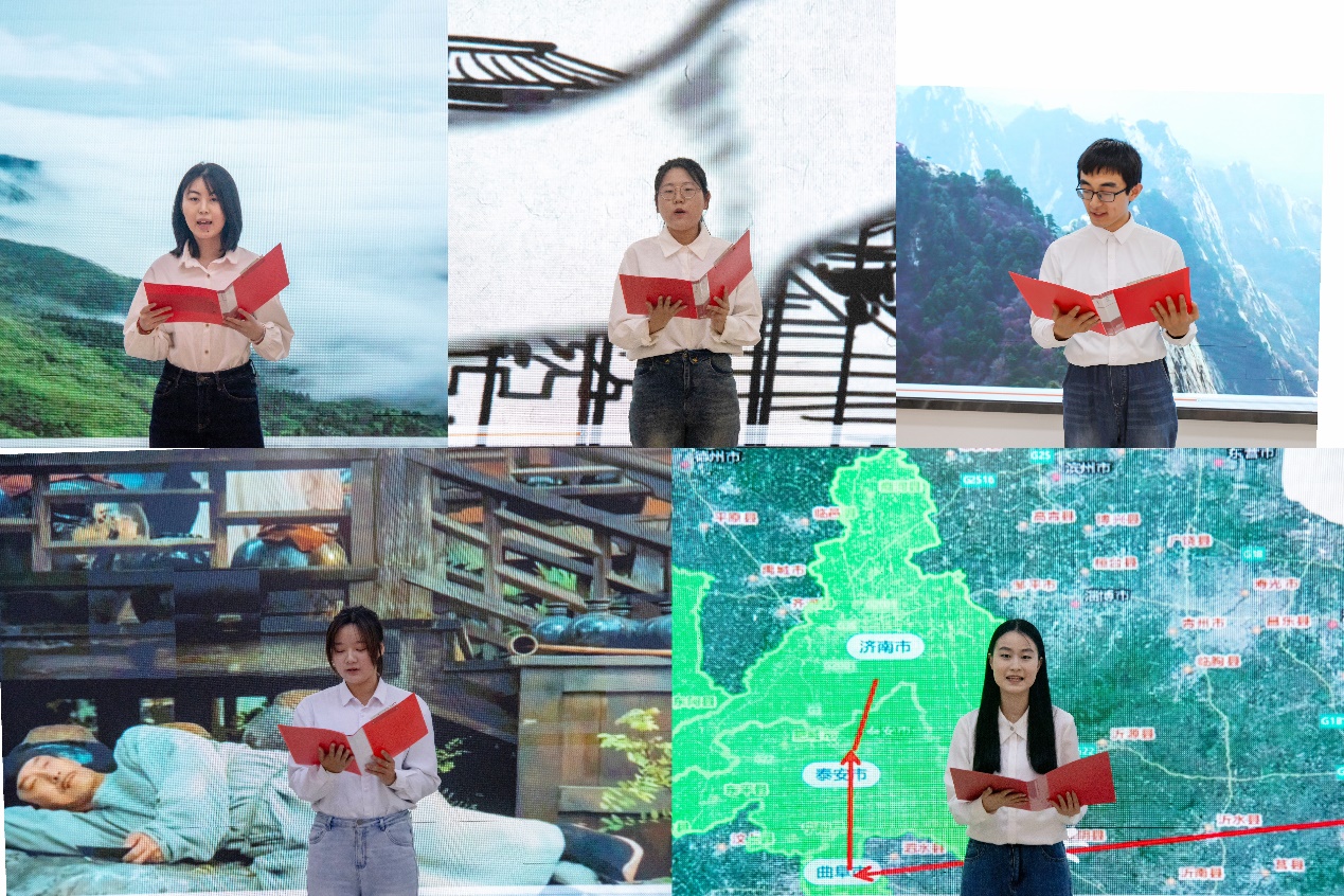 汉语2201班班长王子芃首先聚焦“两会”发展愿景,领学政府工作报告中文化自信相关内容,深入解读文化强国战略与青年责任担当。杨兴潭、郝佳珠作为学生代表结合社会实践、新闻宣传依次分享学习体会,展现“文化+青年”的多样可能。陈怡心、薄纯璐、袁康馨等学生以国家级大创项目为背景、自编自导情景朗诵作品《五岳颂歌·穿越千年的山水诗篇》,更是将班会气氛推向高潮。