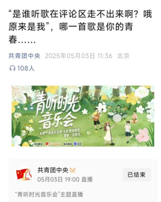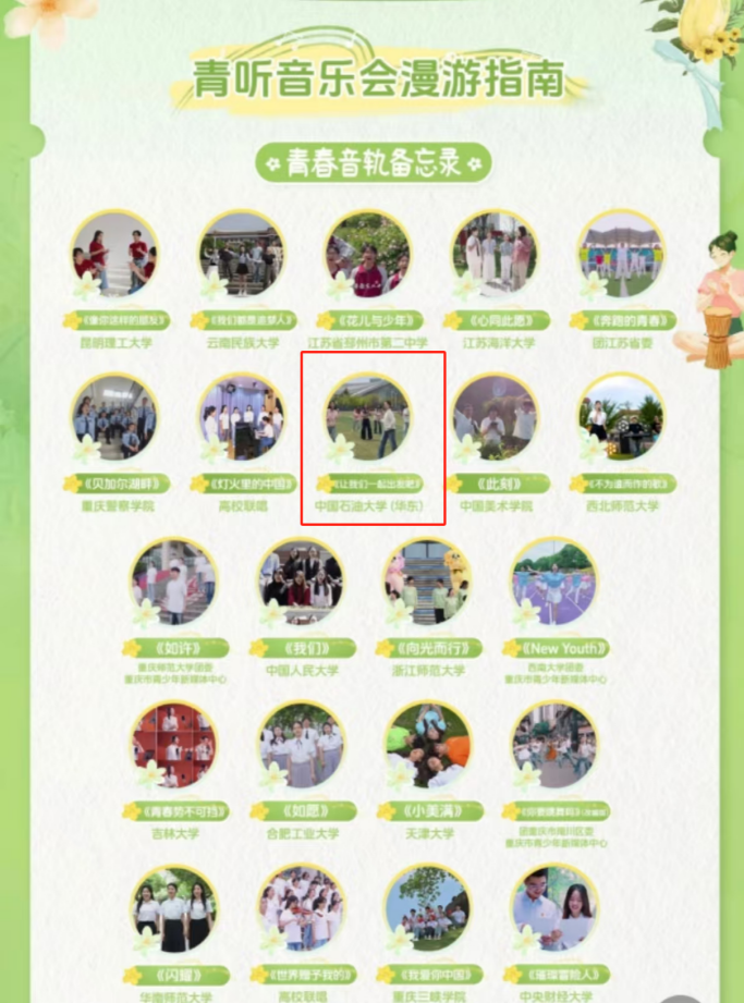 青听时光音乐会由共青团中央宣传部举办,音乐会围绕青春、奋斗、音乐、成长等主题,展示积极向上的新时代青年风采。在全国范围内共遴选26个高校作品进行展播。
