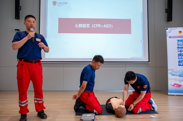 为帮助师生更好地掌握急救技能,李斌及其团队成员现场演示了心肺复苏术(CPR)的操作流程和自动体外除颤器(AED)的使用方法。演示内容包括环境安全判断、患者意识确认、胸外按压、人工呼吸等关键步骤,并进行了细致的讲解和规范操作。在互动环节,学生们踊跃参与实践,在救援队员的指导下进行模拟操作,进一步加深了对急救知识的理解和掌握。法学2403团支部成员王可欣表示:“李队长的讲解生动实用,让我深刻认识到溺水的危险,也学会了很多自救和救人的方法,收获满满。”