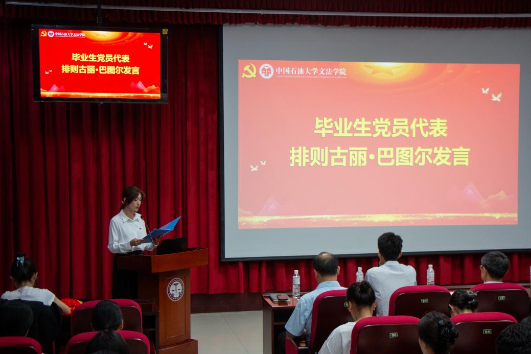 排则古丽·巴图尔代表毕业生党员发言。她表示,作为一名受党培养、思想素质过硬的党员,在校园内外都要肩负使命、以身作则,今后无论是在什么岗位上,都需时刻谨记共产党员的身份,争取为社会做更有意义的贡献。