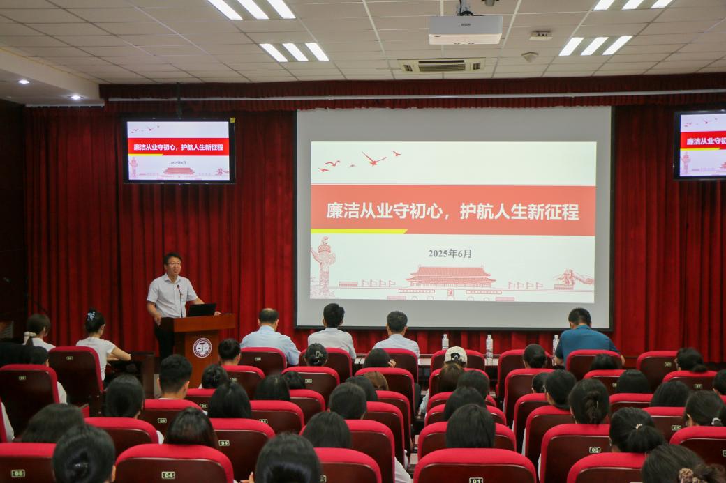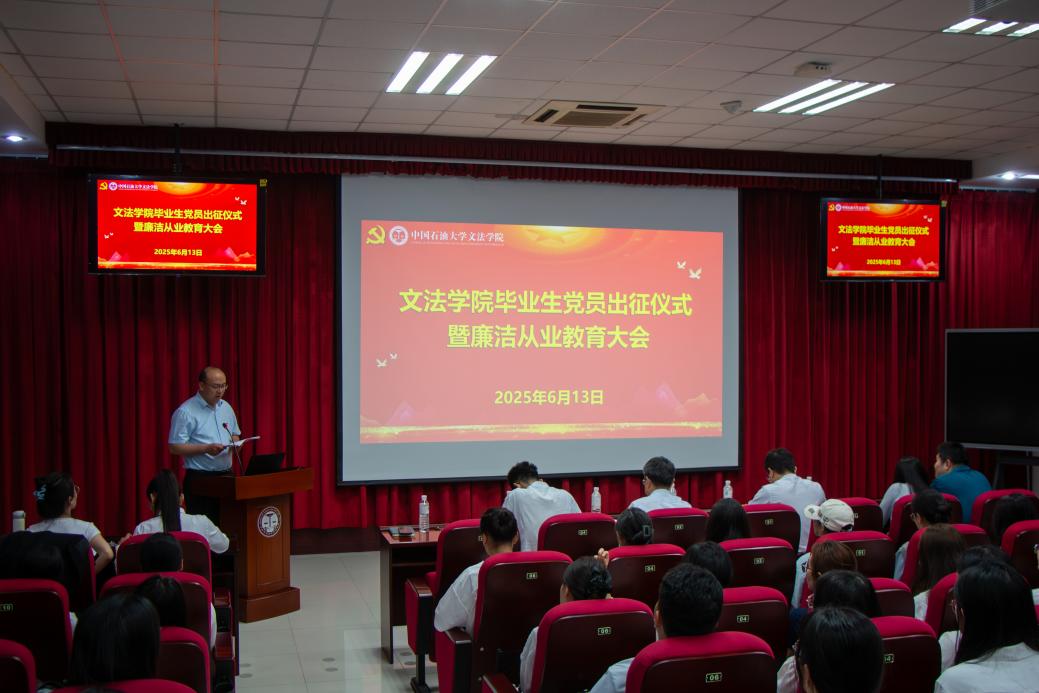 6月13日下午,太阳成集团tyc122ccvip2025届毕业生党员出征仪式暨廉洁从业教育大会在文理楼142举行。仪式由党委副书记陈熙主持,党委书记姚成郡、学校纪委监督检查室主任李健、毕业班辅导员及2025届全体毕业生党员参加仪式。