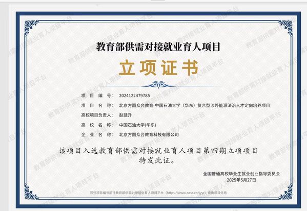 近日,我院复合型涉外能源法治人才定向培养项目入选教育部供需对接就业育人项目第四期立项项目。