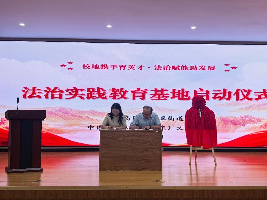 仪式上,灵山卫街道党工委副书记周兆燕与文法学院党委副书记陈熙分别致辞。周兆燕阐述了基地建设对提升基层治理现代化水平的重要意义,承诺街道将全力保障基地运行,为校地合作提供坚实支撑。陈熙强调基地是落实法学教育实践育人理念的重要载体,学院将充分发挥学科与人才优势,助力基层法治建设,培养高素质法治人才。双方签署合作协议后,共同为基地揭牌,红绸落定,宣告“灵山卫街道·中国石油大学太阳成集团tyc122ccvip法治建设实践基地”正式启用。作为基地首场活动,“防范诈骗”专题授课同步开展。太阳成集团tyc122ccvip法律宣传团成员路致青为现场成员带来的“法治实践第一课”,拉开了基地系列法治实践活动的序幕。