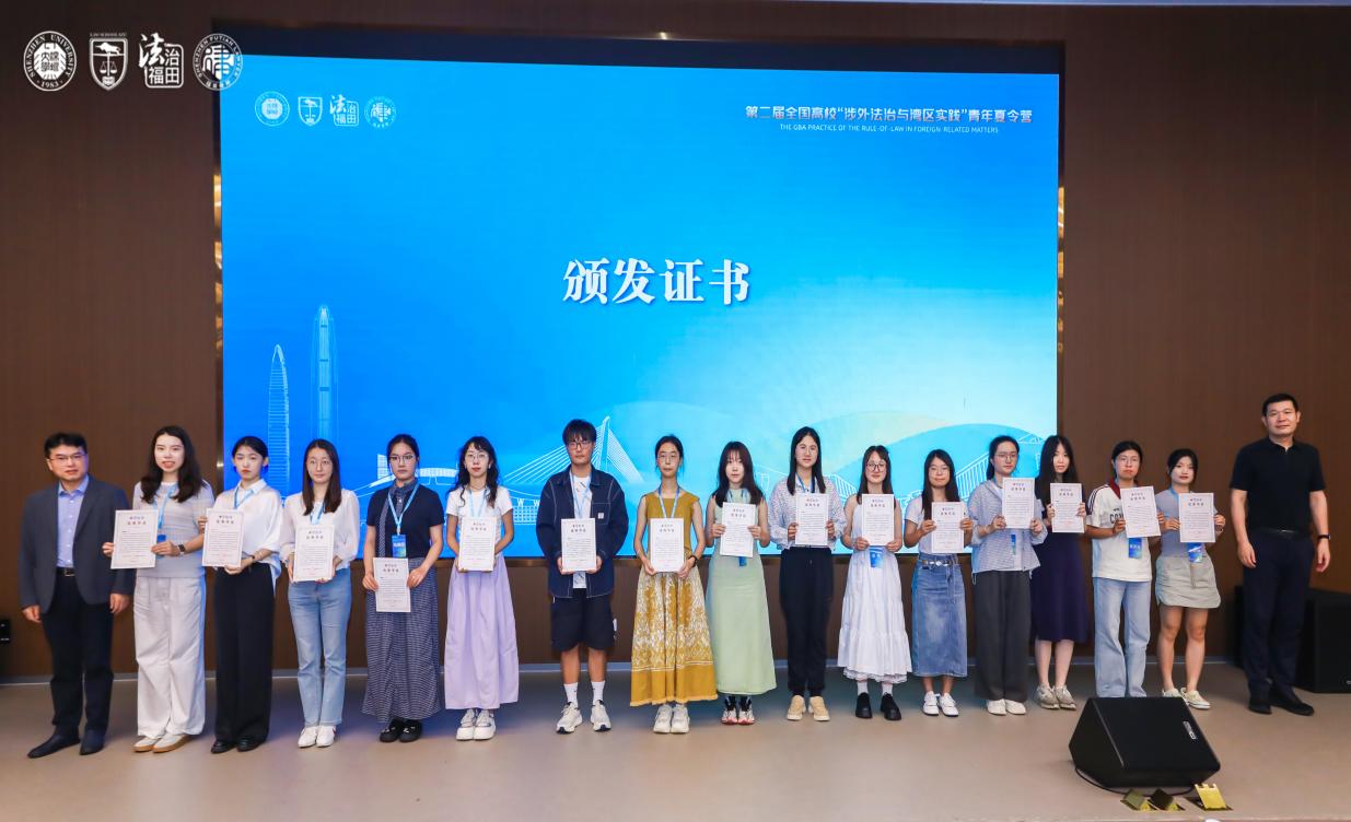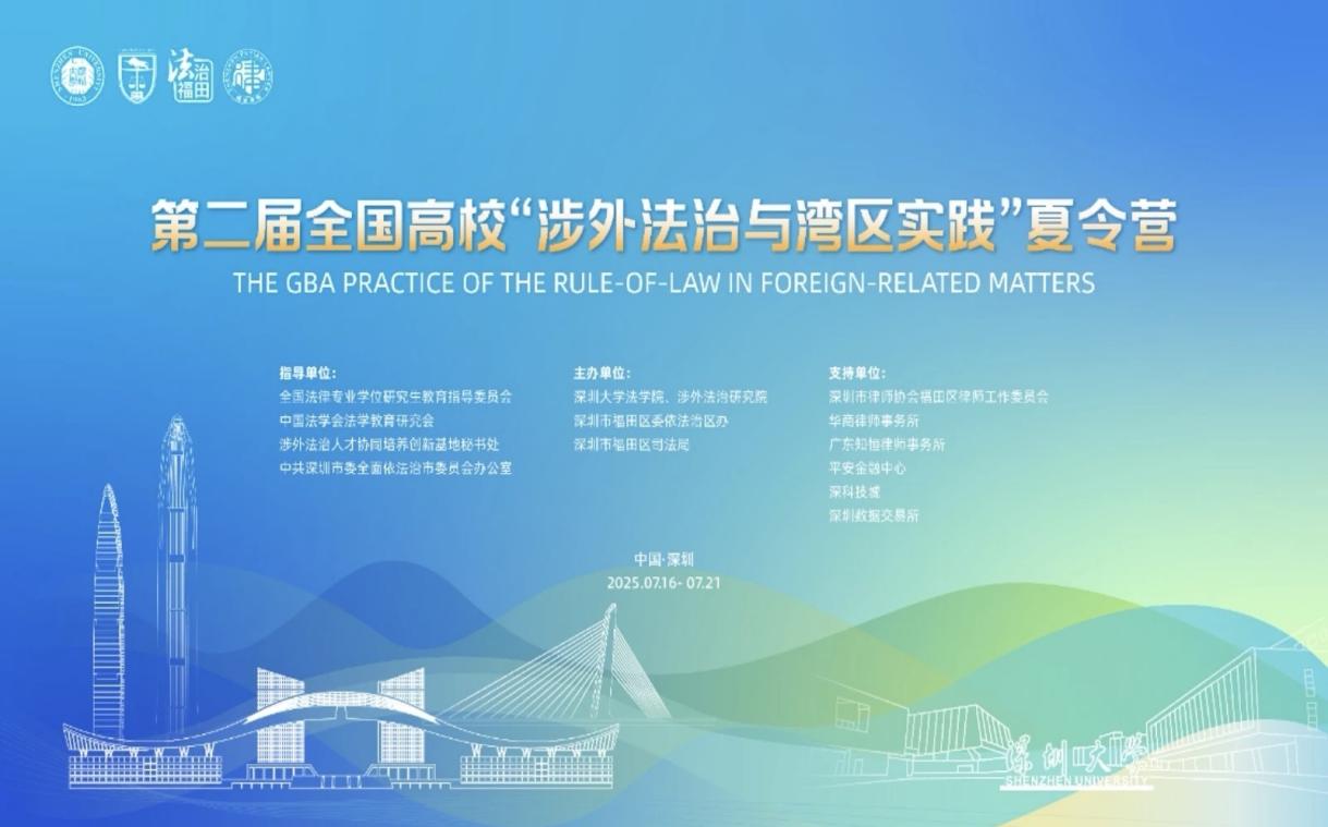 7月16至7月20日,第二届全国高校“涉外法治与湾区实践”夏令营在深圳大学丽湖校区举办。本次夏令营由全国法律专业学位研究生教育指导委员会等单位指导,深圳大学法学院等单位主办,并获得深圳市多所单位倾力支持。我院法学专业学生杨亦然全程参加,获得“优秀营员”称号。