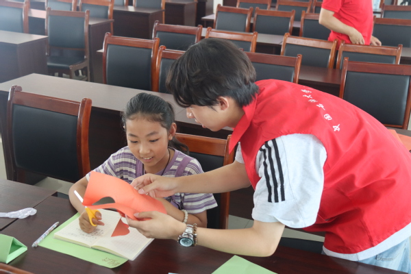 随后的传统文化课程带领孩子们动手体验。非遗剪纸课上,孩子们学习剪出象征吉祥的“福”字。书法课上,队员们重点解析了“灋”字的结构——其横平如天平象征公平,竖直似准绳代表正直,帮助孩子们在书写中体会法治精神的内涵。此外,中外神话故事课激发了孩子们的想象力,让他们在奇幻的叙事中感受文明的传承。