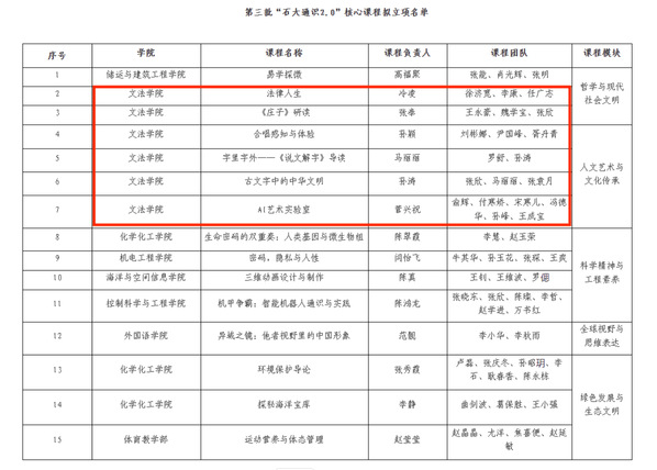 近日,学校教务处公布了第三批“石大通识2.0”核心课程立项名单。经个人申报、单位推荐、通讯评审、现场答辩,确定第三批“石大通识2.0”核心课程15门,我院6门课程成功入选。