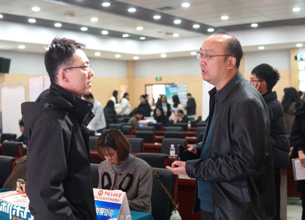 梁涛在招聘会现场与学院就业辅导员交流 杨倩摄