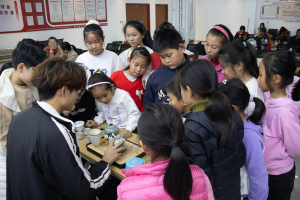 茶艺课上,队员们先向孩子们展示了精致的茶具,一一介绍名称与用途。随后,从温杯烫器、投茶注水,到轻轻摇晃茶杯、静待茶叶舒展,每一个步骤都讲解得细致入微。孩子们好奇地围在桌旁,脸上满是认真。